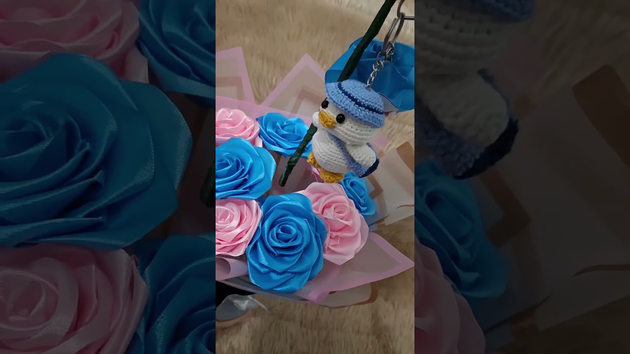 باقه ورد ستان فاخرة تضم وردة مميزة بالمنتصف تحتوي على ميدالية أميجرومي على شكل (بطه لطيفه ) و ورده ساتان بلون جنس الجنين 💙🩷